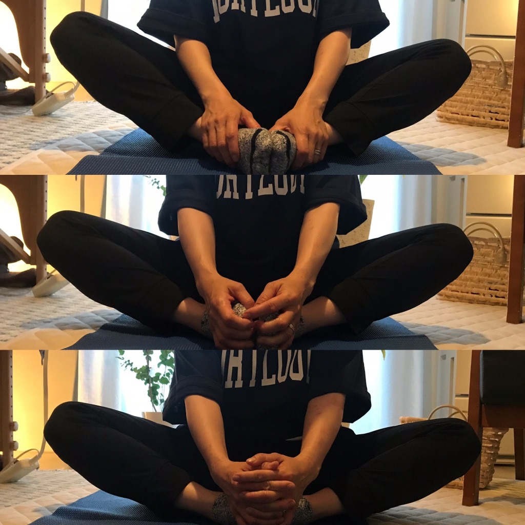 身体の変化を感じてもらうために、エクササイズの合間に前屈や後屈、あぐらポーズなどでチェックをします。