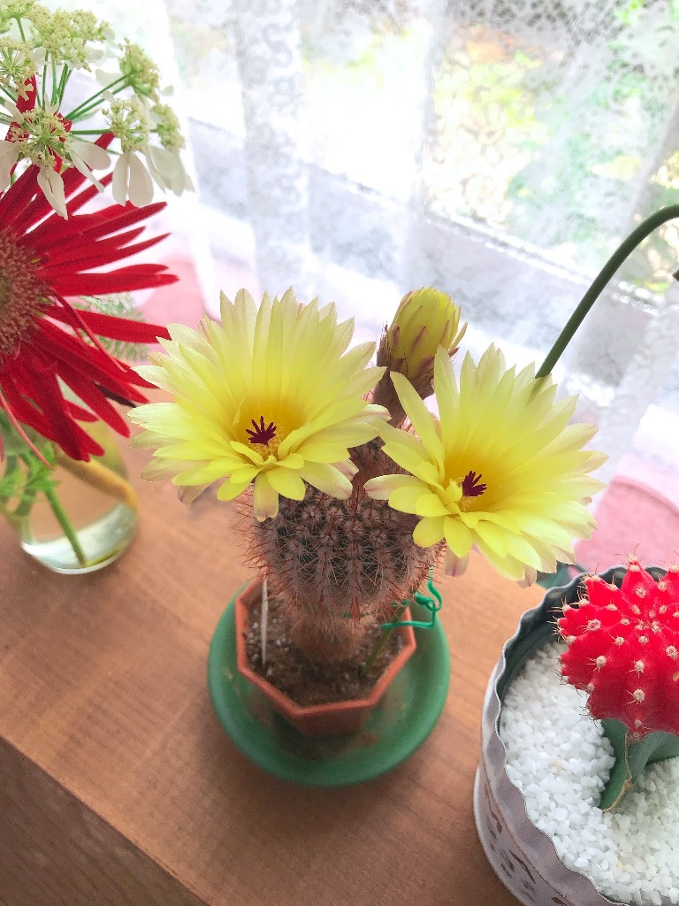 写真のお花は今年サボテンに蕾がつき、初めて花を咲かせてくれました!
