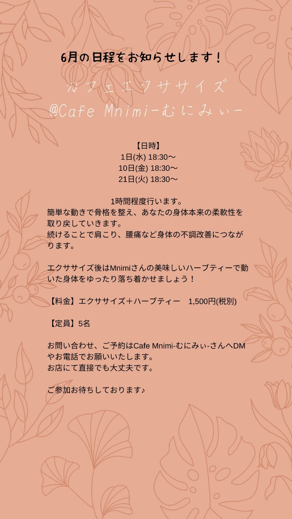 天文館近くのcafe Mnimi-むにみぃ-さん開催させて頂いている美容姿勢エクササイズ教室✨